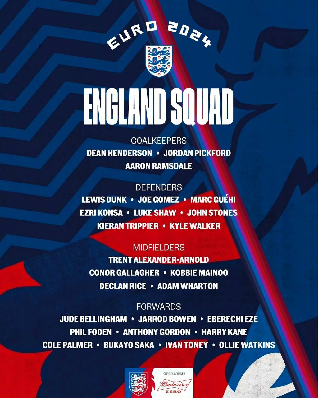 英格兰(3421):1-皮克福德/2-沃克、5-斯通斯、6-格伊/7-萨卡(90'14-孔萨)、26-梅努(90'16-加拉格尔)、4-赖斯、12-特里皮尔(46'3-卢克-肖)/11-福登(80'24-帕尔默)、10-贝林厄姆/9-凯恩(80'19-沃特金斯)