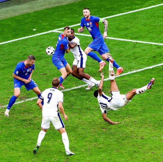 第15分钟,凯恩禁区内凌空抽射,被邓弗里斯踢中脚部后倒地,主裁判回看录像后判罚点球,邓弗里斯得到黄牌。第18分钟,凯恩主罚点球一蹴而就,1-1,英格兰追平比分。凯恩连续两届欧洲杯半决赛进球,欧洲杯淘汰赛凯恩一共射进6球,超越5球的格列兹曼,排名历史第一。