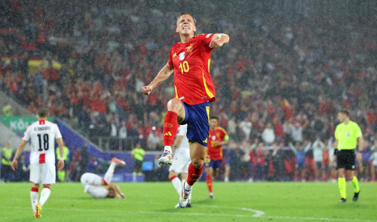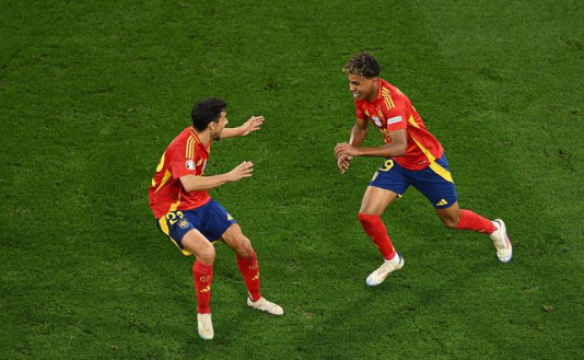 西班牙(4231):23-乌奈-西蒙/2-卡瓦哈尔、3-勒诺尔芒(83'4-纳乔)、14-拉波尔特、24-库库雷利亚/16-罗德里(46'18-祖比门迪)、8-法比安-鲁伊斯/19-亚马尔(89'6-梅里诺)、10-奥尔莫、17-尼科-威廉斯/7-莫拉塔(68'21-奥亚萨瓦尔)